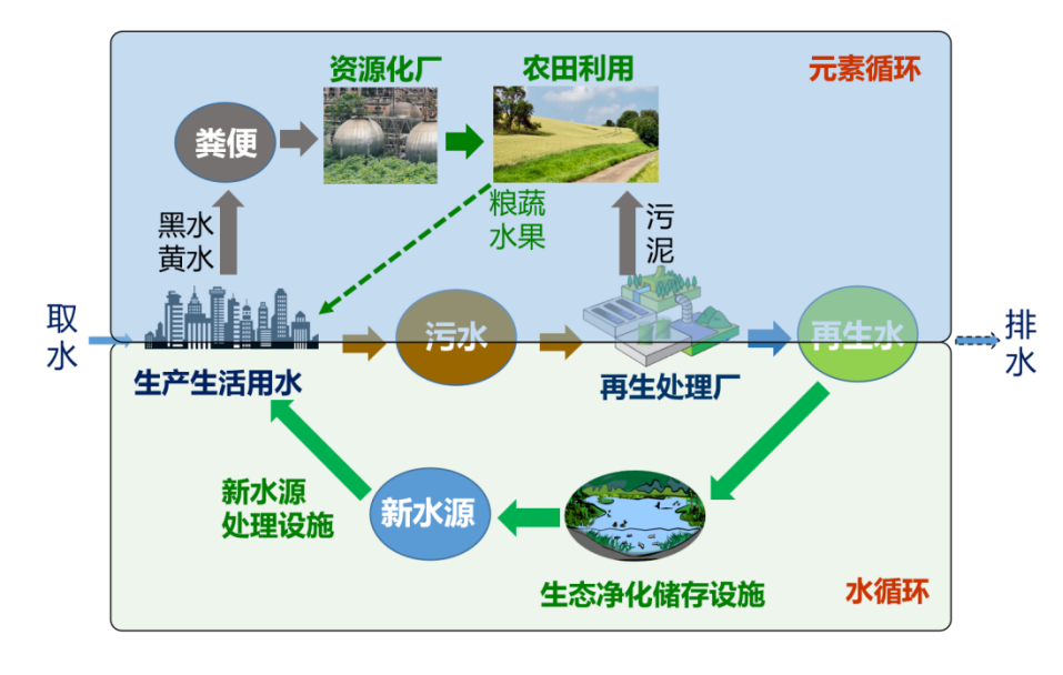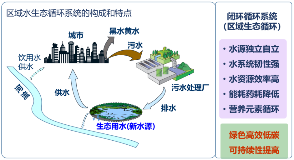 四是水的区域生态循环系统。通过构建“区域生态循环系统”(再生水区域循环利用),代替当前的“流域工程循环系统”,能够有效提高水资源的利用率,增强水系统韧性,并降低能耗和用水成本。这里的“区域”不局限于城市内部,而是在不受上游限制、不影响下游的情形下,在一定区域内实现水资源的自给自足。具体而言,可以在取水用水及处理后,将排水排入一定区域内自己的水体,并将其作为新水源进行再利用。
