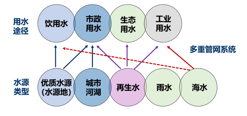 一是多类水源分级供水系统。水源种类包括水源地、城市河湖、再生水、雨水和海水,用水途径包括饮用水、市政用水、生态用水、工业用水等。根据不同的用水需求,通过多重管网系统进行分级供水,实现水资源的优化利用。根据清华大学董欣副教授团队的测算,如果能够实现水资源的完全循环利用,城市可用水资源量可以放大到6.7倍,从而彻底改变城市水资源利用的格局。